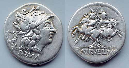 C. Serveilius M.f., AR Republican Denarius, 136 BC. Helmeted head of Roma right, wreath and * behind, ROMA below. The Dioscuri galloping in opposite directions, C . SERVEILI . M . F in exergue. Cr. 239/1, Syd. 525, Servilia 1. Ex. Calgary Coins.