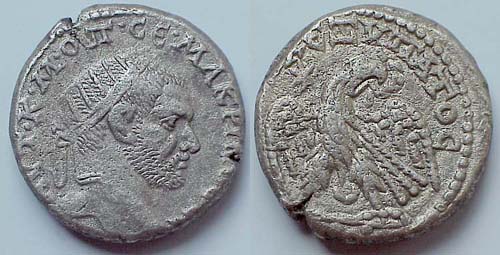 Macrinus, AR Tetradrachm, 217-218, Mesopotamia-Carrhae. AYT K M OP CE MAKPINOC CE Radiate head right. DHMAPX EX YPATOC Eagle seen from front with head and tail to right and spread wings, crescent between legs, star in upper left field, three pellets in exergue. Preiur 833. |