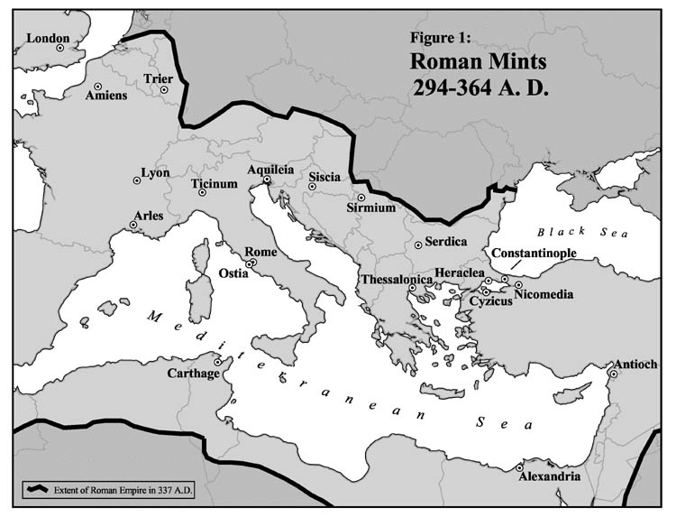 Map drawn by Jay Ritchie for Failmezger's Roman Bronze Coins from Paganism to Christianity 294-364 AD. Used with permission of the author, all rights reserved. The following mints produced the VLPP series during the listed years: Arles - 319-320London - 318-320 Lugdunum (Lyon) - 319-320 Rome - 315 Siscia - 318-320 Ticinum - 315, 318-319 Trier - 318-319 Note - all of the Western mints, controlled by Constantine I, that were open during the period of 315-320, minted coins for this series. None of the Eastern mints, controlled by Licinius, minted these coins. Although coins with this reverse were minted for Constantine I, Constantine II, Crispus, Licinius I and Licinius II, the series originated for Constantine I as evidenced by the small module solidii, minted in 315 at Rome and Ticinum. |
