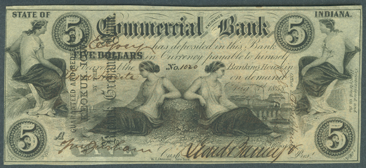 Indiana, Terra Haute - $5 Commercial Exchange Bank (Late 1850s)