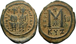 Justin II, Æ Follis, Year 10 (574/575), Cyzicus, Officina 1