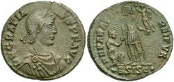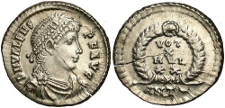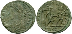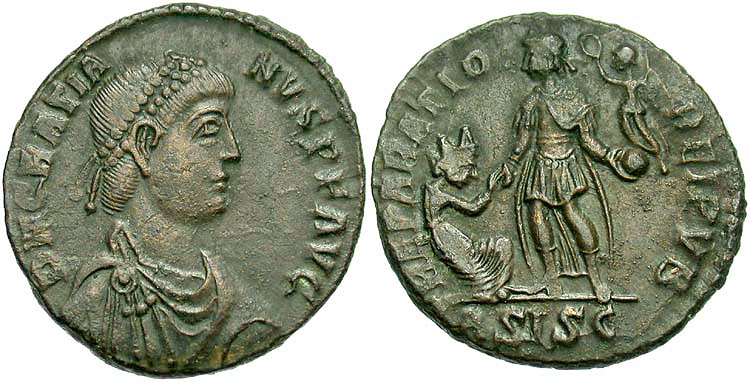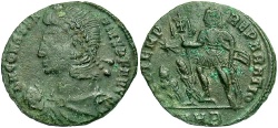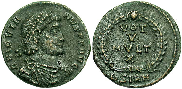 Crowned, cuirassed bust facing, shield in left hand, globus cruciger in right
