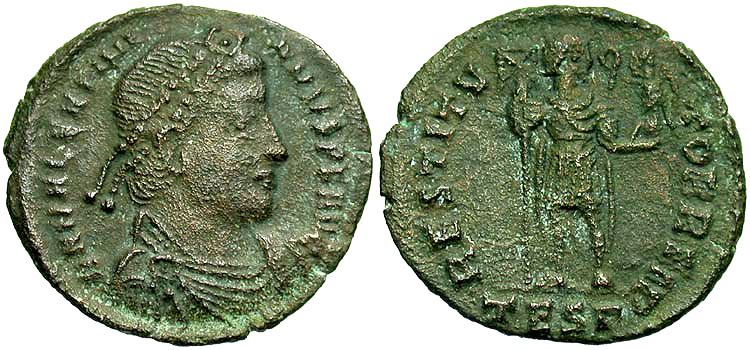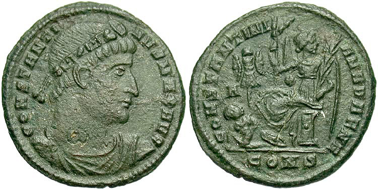 surmounted by tufa with three pellets, labarum in right hand, globus