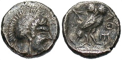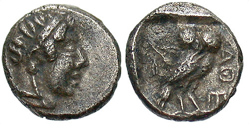 Helmeted head of Athena right, helmet decorated with three olive leaves
