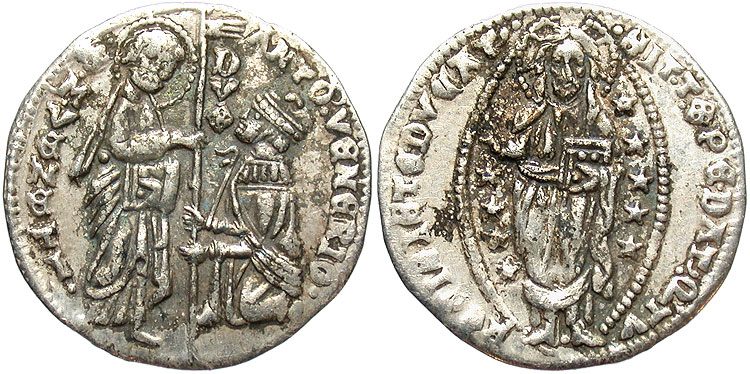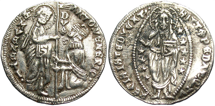 Doge kneeling left before nimbate St. Mark standing right, both holding pendant flag between them,