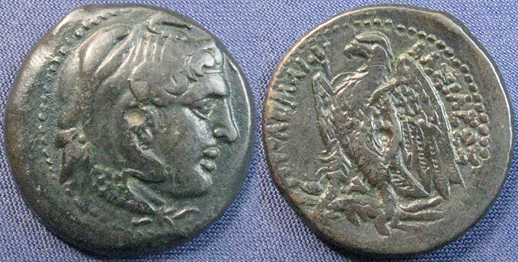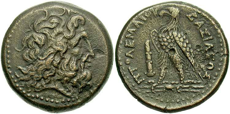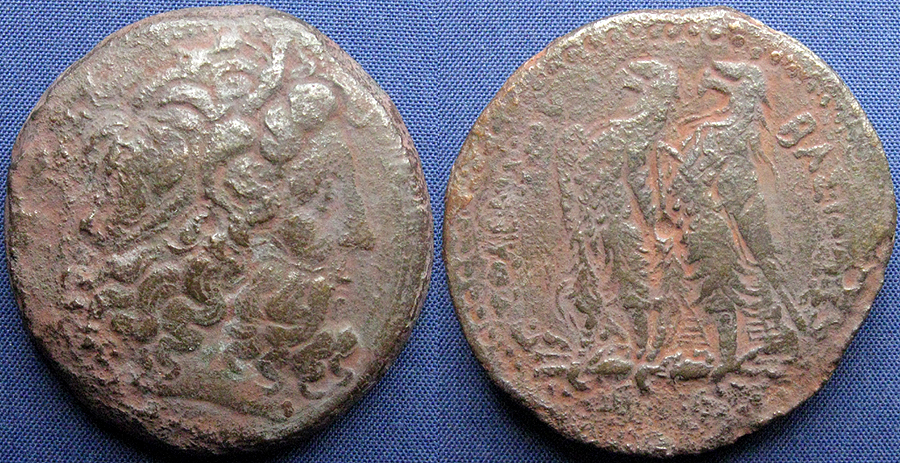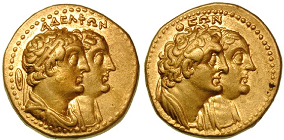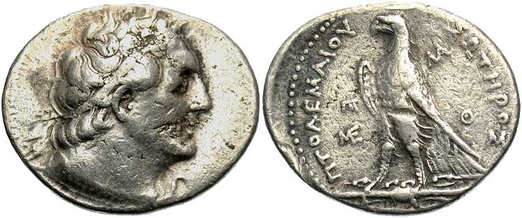 an issue of Ptolemy II Philadelphos, minted after 265 BC or Ptolemy III Euergetes, minted 246-221 BC.