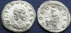 Concordia seated left, patera in right hand, double cornucopiae in left