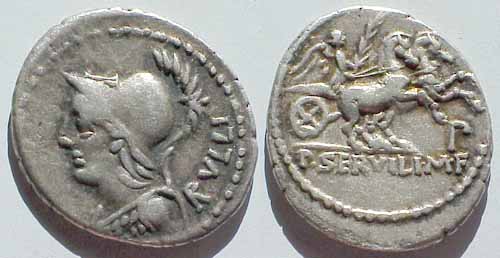 P. Serveilius M.f. Rullus, AR Denarius, 100 BC. Bust of Minerva left, wearing crested helmet and aegis, RVLLI behind. Victory in biga right, holding palm, P below horses, P . SERVILI . M . F in exergue. Cr. 328/1, Syd. 601, Servilia 14.