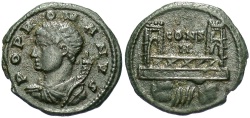 The Milvian Bridge is where Constantine the Great and Maxentius battled in 312. The bridge is part of the Via Flaminia and spans the Tiber River a few miles north of Rome. The bridge may have originally been constructed of wood in 220 BC, but was rebuilt with stone in 109 BC. Perhaps the bridge at one time did look like the one on the coin. The one standing today only contains parts of the ancient bridge. Take note of the towers on the far end. Those do look similar to the coin, but without the round objects on top, thought possibly to be signal beacons by come numismatists. Here is a photograph of how the Milvian Bridge stands today.