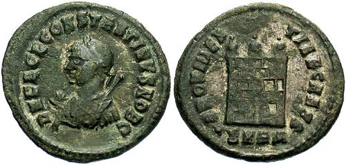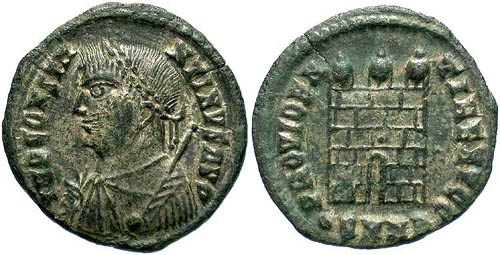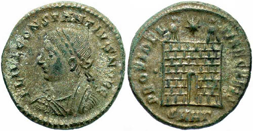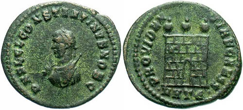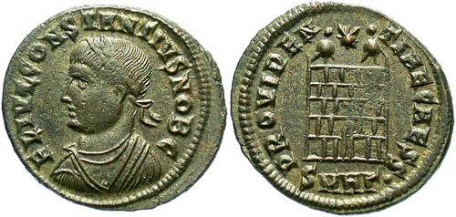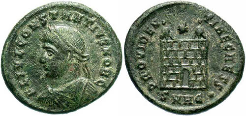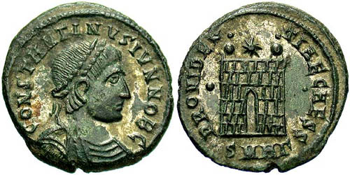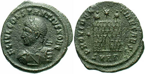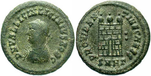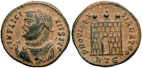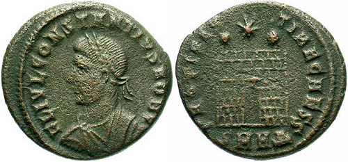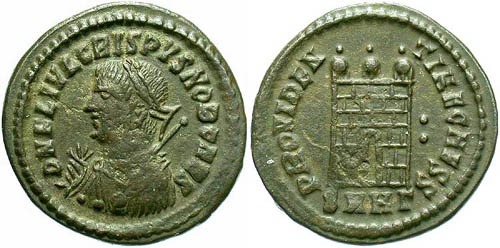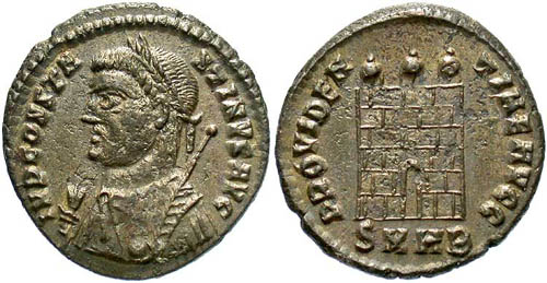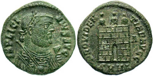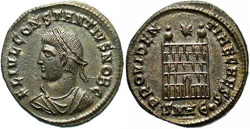 Mule of Licinius II for obverse and Licinius I (?) for reverse. This may be an imitative product instead of an official mint issue.