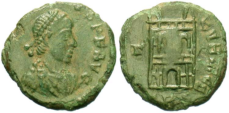 Struck 368 AD. Pearl-diademed, draped, and cuirassed bust left / Two-towered