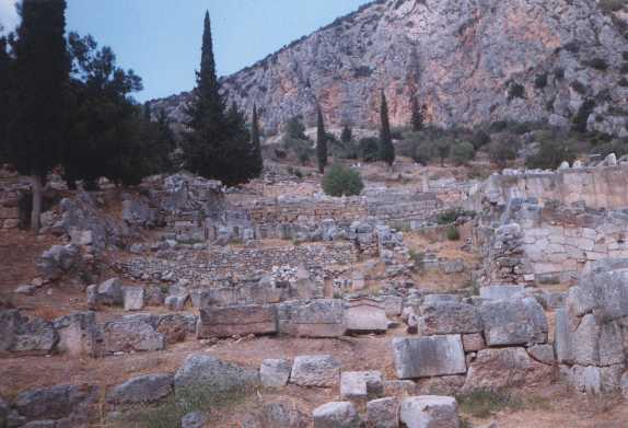 The sanctuary area of Apollo at Delphi is an expansive layout of buildings, following a path, known at "The Sacred Way", in the Parnassus Mountains. In the distance, the sanctuary is shown amongst Cyprus trees.