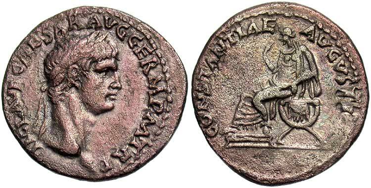 Securitas seated left, globe in right hand, left arm resting on arm of