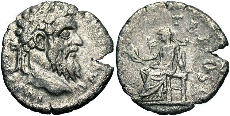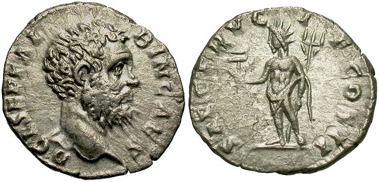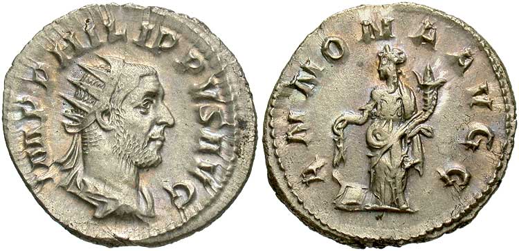 Abundantia standing right, emptying coins from cornucopiae |