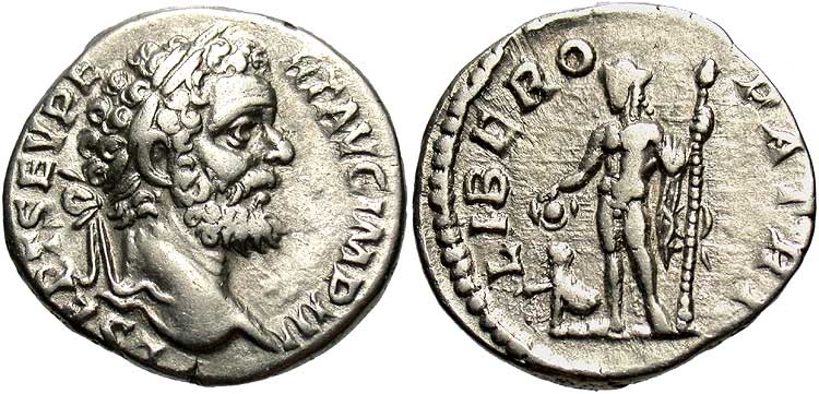 Aeternitas standing front, head left, phoenix on globe in right hand, leaning on