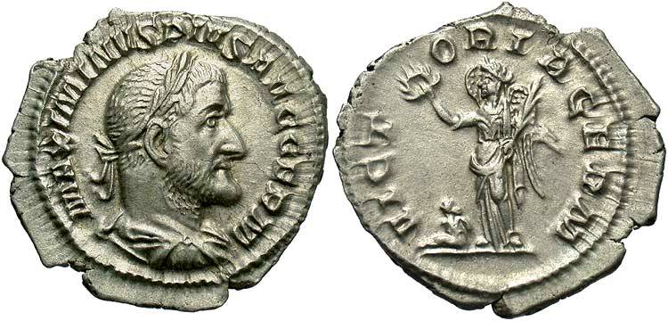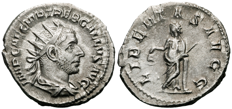 Virtus, helmeted, right breast exposed, standing left, Victory in right hand,