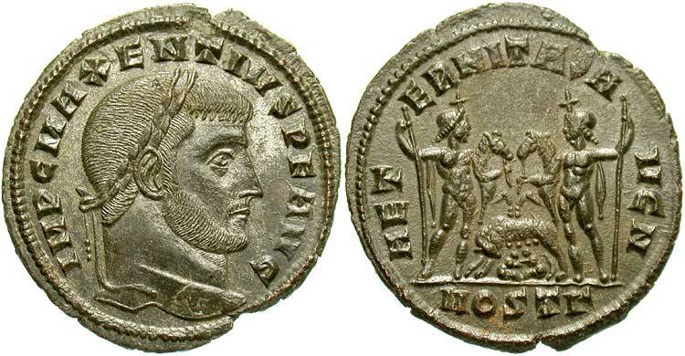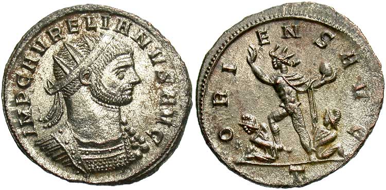 Sol treading down captive at left, right hand raised, globe in left, another captive at right |