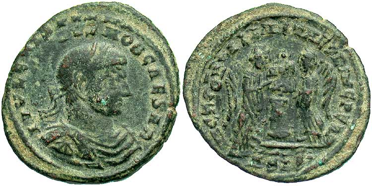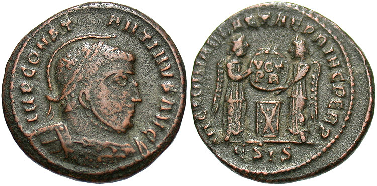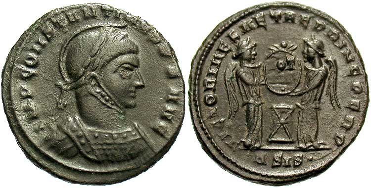 Two Victories, standing facing each other, inscribing shield with VOT | PR on altar with stylized I