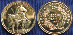 Laurels enclosing 7.500.000 / LIRA / 1999, Turkish symbol above