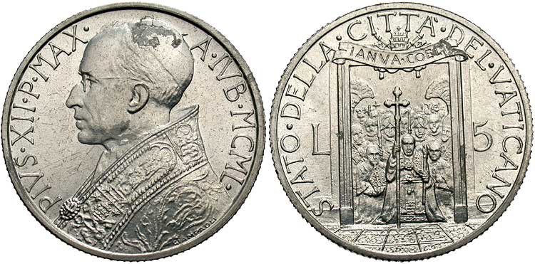 Pope Pius XII, AL 5 Lire, 1950, Rome, Holy Year issue