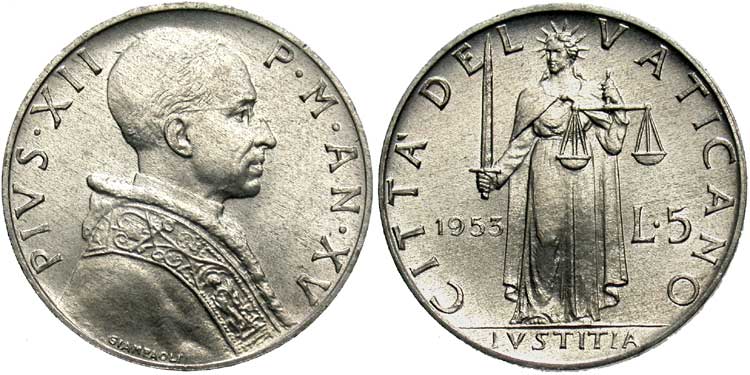 Pope Pius XII, AL 5 Lire, 1953, Rome
