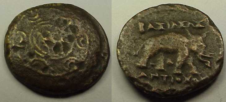 Antiochos I (Seleukid Empire), AE19, Antioch. No legend. Macedonian shield with anchor in center. BASILEWS | ANTIOXOY. Elephant with horns and tusks, trunk down, walking right. Sear GCV 6881; Lindgren II, 1759; BMC 36.