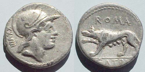 P. Satrienus, AR Denarius, 77 BC. Head of young Mars right, XXVIII behind. ROMA above she-wolf walking left, P . SATRIE | NVS in exergue. 3.83g. Cr 388/1b; BMC 3209-37; Syd 781a; Satriena 1. Note: This type refers to the foundation of Rome. Mars was the father of Remus and Romulus.