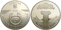 Column, architectural scenes in background, ancient Pantikapaion coins above, 2600th anniversary of the city of Kerch in